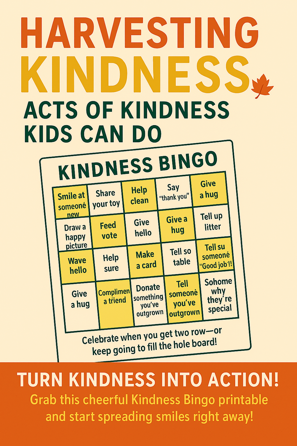 Harvesting Kindness: Acts of Kindness Kids Can Do πŸ’› Turn kindness into action this fall! These simple, hands-on activities help toddlers and preschoolers practice empathy and spread joy β€” from sharing smiles to helping at home. ✨ Includes a free printable Kindness Bingo to make kindness fun! πŸ‘‰ earlylearningmadeeasy.blogspot.com